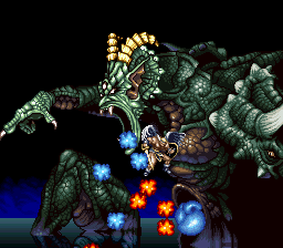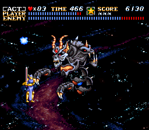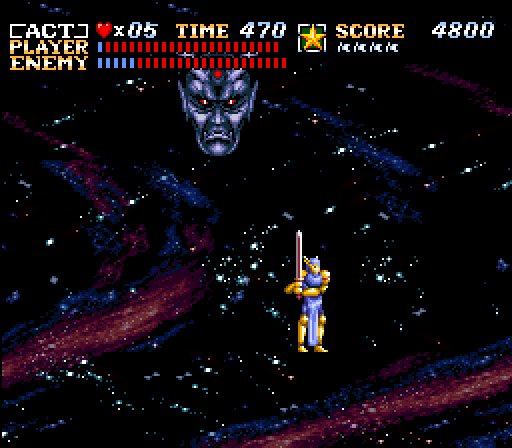 A secret code in ActRaiser 2 pits you against Tanzra's forms from the first ActRaiser. The battle now is considerably harder since the Master is much slower in this game.